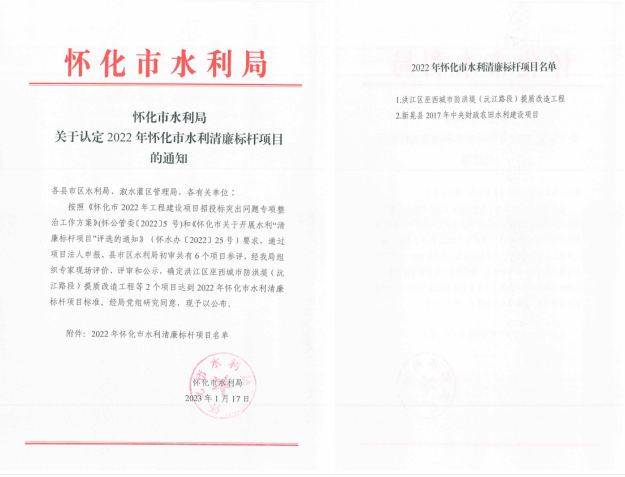 近日,从怀化市水利局传来消息,荣耀体育官方(洪江区巫西城市防洪堤沅江路段提质改造工程)喜获“2022年度怀化市水利清廉标杆项目”荣誉,清廉建设取得明显成效和充分认可。