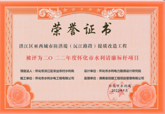 荣耀体育官方(洪江区巫西城市防洪堤沅江路段提质改造工程)荣获怀化市2022年度水利清廉标杆项目
